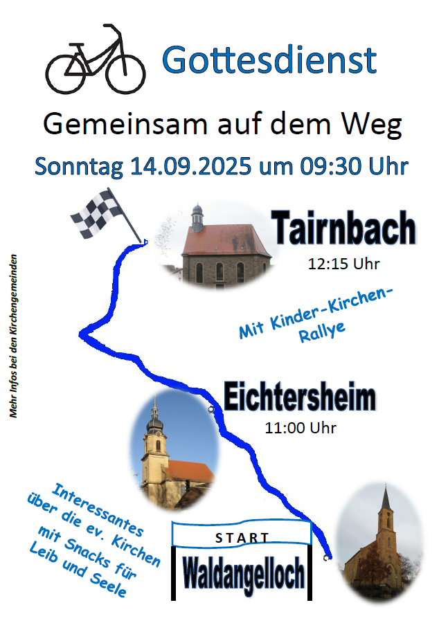 Am 14. September, dem letzten Tag der Sommerferien, gab es für Gemeindeglieder aus Angelbachtal, Waldangelloch, Eschelbach und Mühlhausen-Tairnbach einen Gottesdienst der anderen Art. Unter dem treffenden Motto „Gemeinsam auf dem Weg” führte der erste Regio-Fahrrad-Wandergottesdienst die Teilnehmenden per Fahrrad zu drei der fünf Gemeindekirchen: von Waldangelloch über Eichtersheim bis nach Tairnbach.