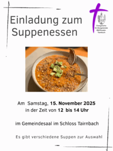 Bereits im letzten Jahr haben wir die oft trüben Novembertage zu einem gemeinsamen, kräftigenden Suppenessen genutzt – und uns erstmals an einem Samstag zu Mittag im Gemeindesaal getroffen. Auch in diesem Jahr wollen wir wieder dazu einladen: am 15. November von 12 bis 14 Uhr. Herzliche Einladung!
